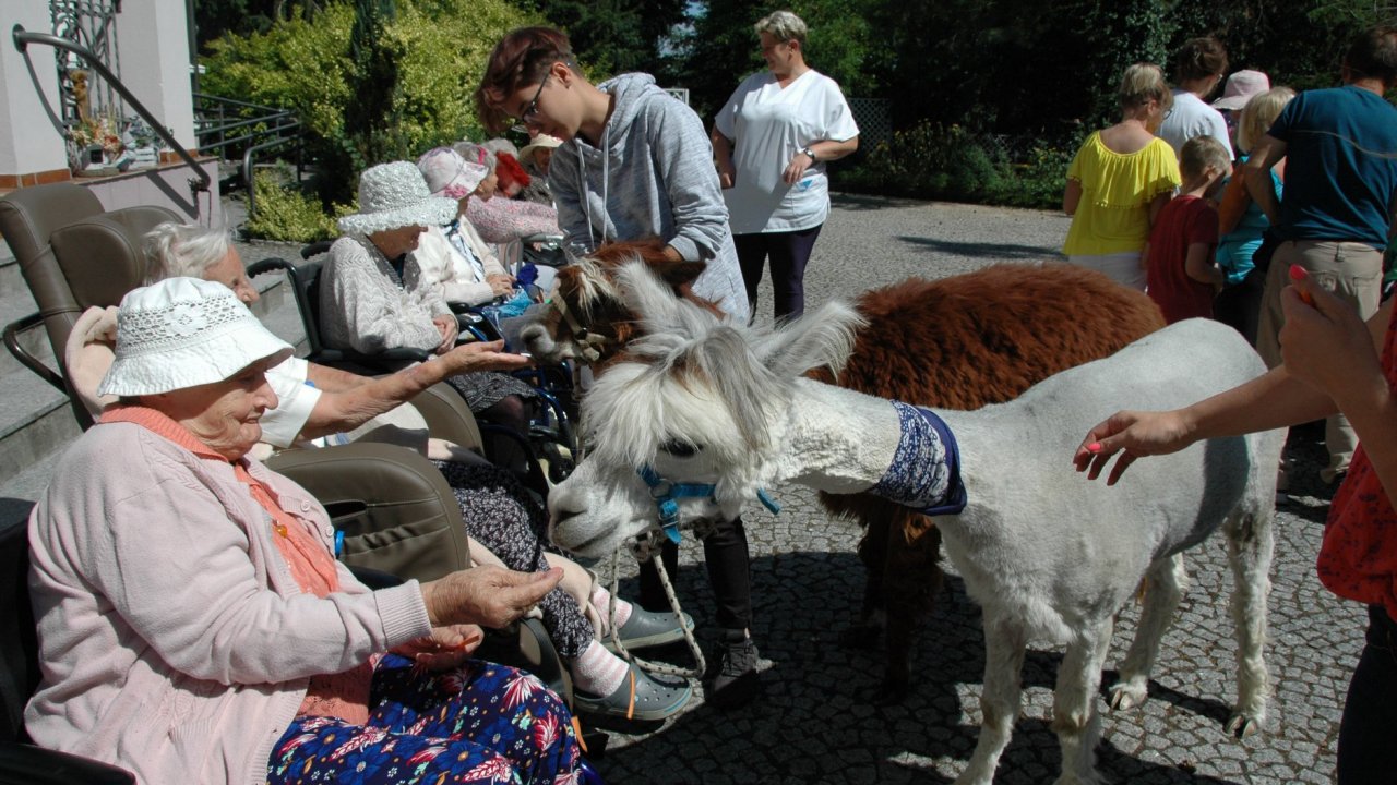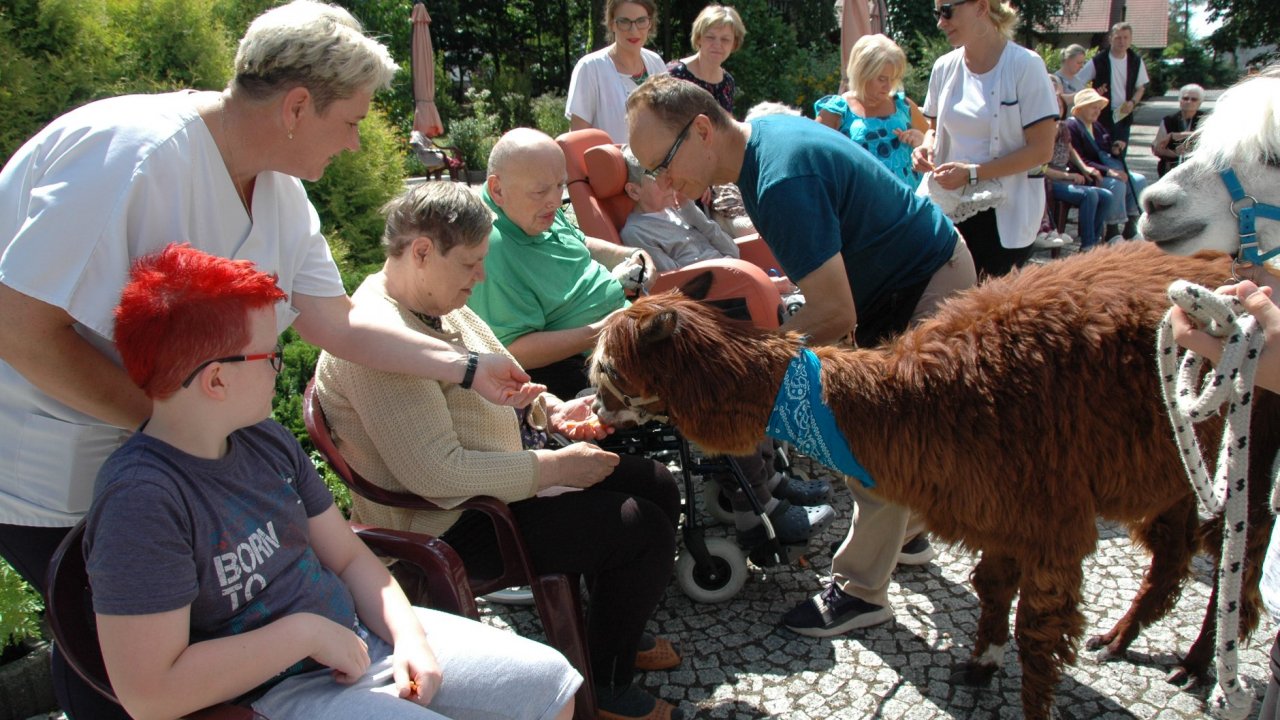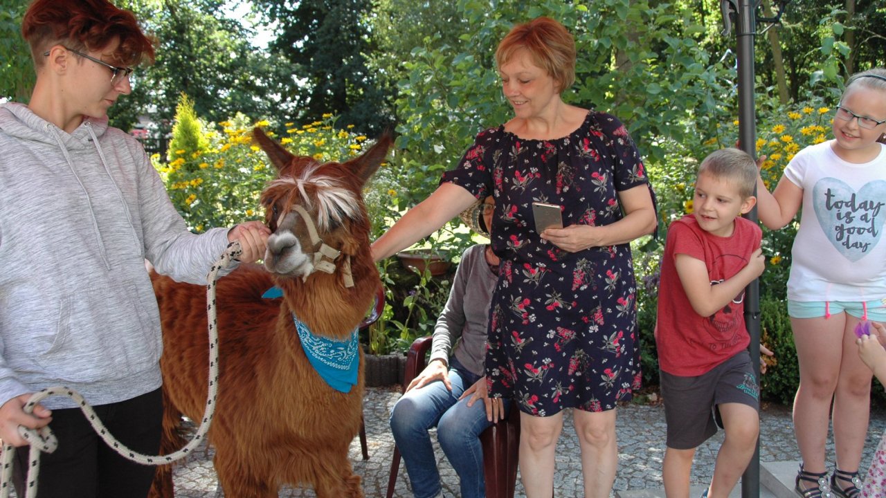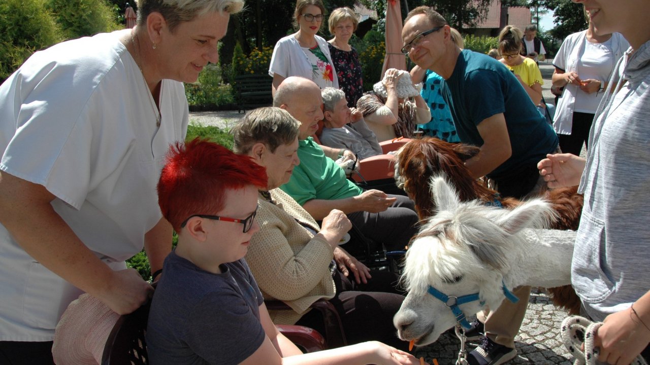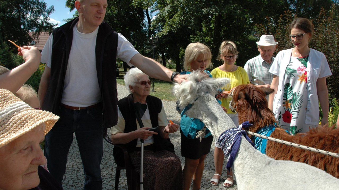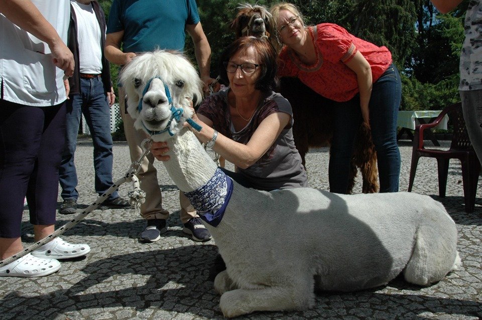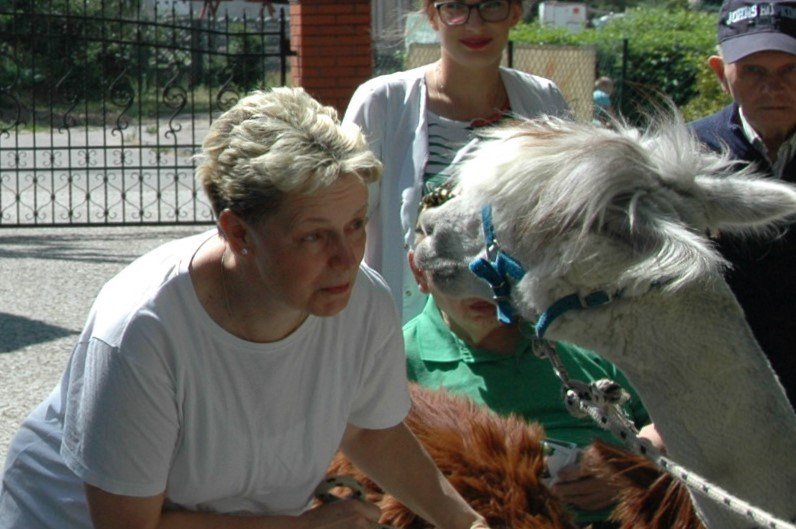 Mieliśmy dzisiaj dużo miłych wrażeń - przyjechały do nas Alpaki z ośrodka "Małe Peru" w Piotrowicach. Przecudne terapeutyczne stworzenia wyglądające jak duże maskotki. Można by o nich powiedzieć: "dłuuugie szyje do przytulania". Na początku wzbudzały trochę respektu - ale szybko podbiły serca dosłownie wszystkich. Wprawdzie nie wszyscy chcieli je nakarmić i sami zjedli marchewkę do karmienia - to się może zdarzyć tylko u nas! Największe zaskoczenie przeżyły chyba jednak osoby leżące, gdy przy swoim łóżku ujrzały takie "uśmiechnięte stwory". W każdym razie na koniec "popatrzyliśmy sobie z Alpakami w oczy" i umówiliśmy się na następne spotkanie w przyszłym roku.