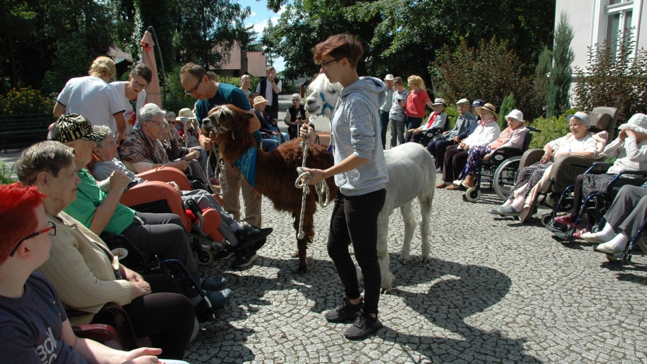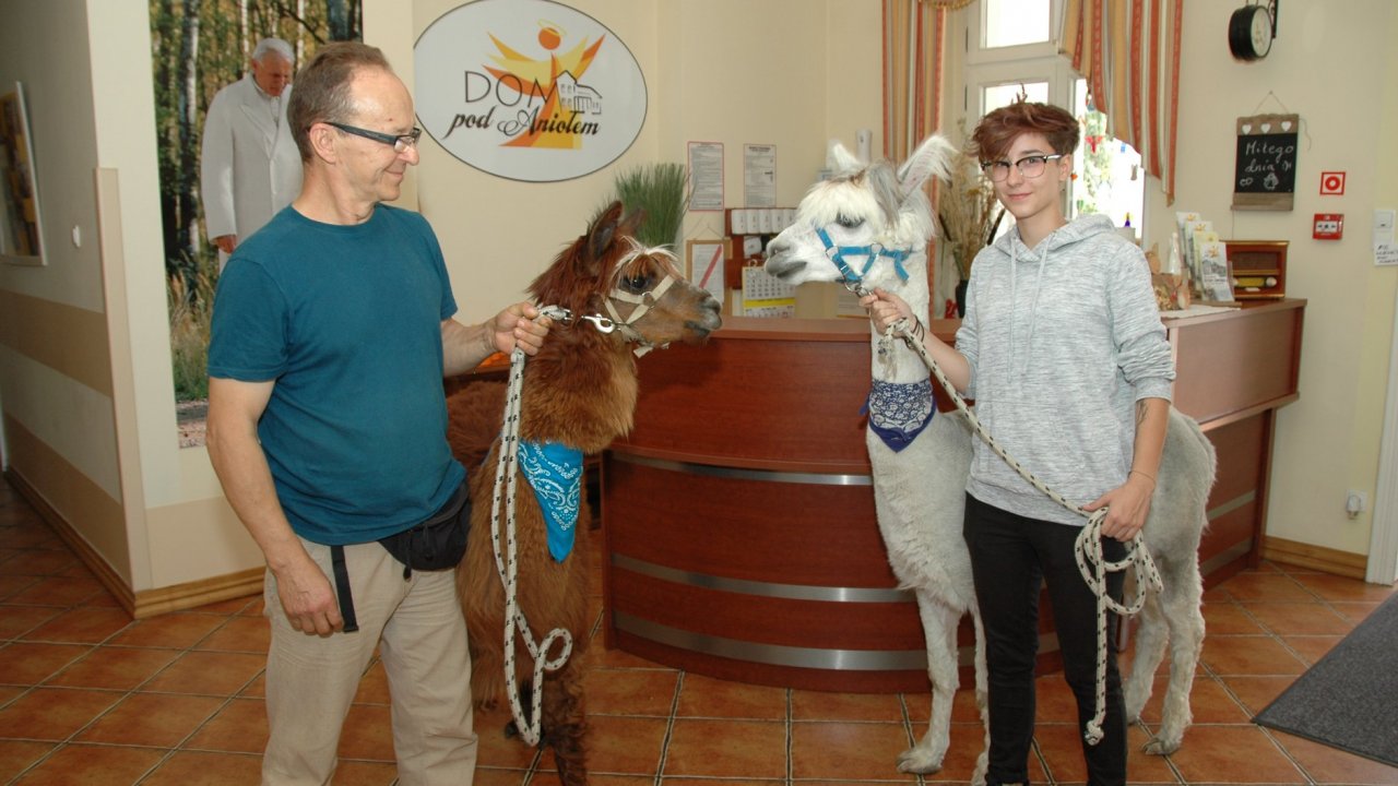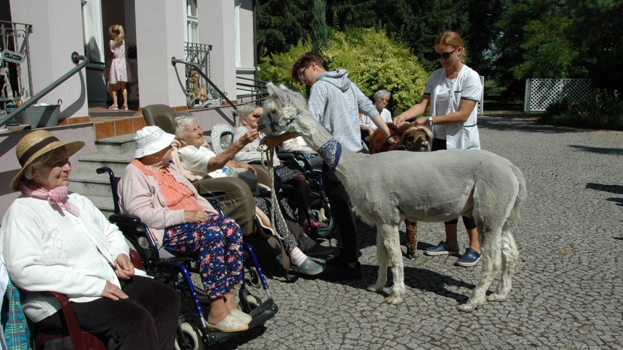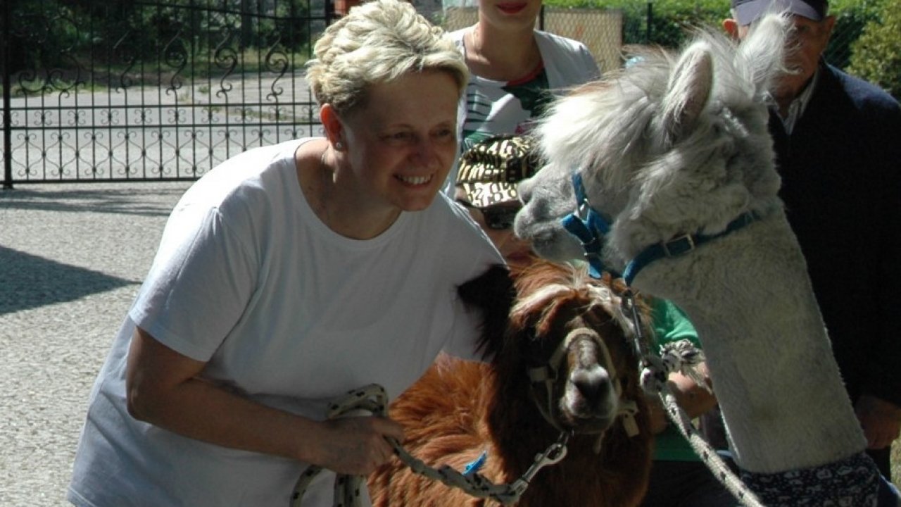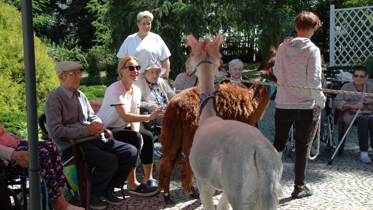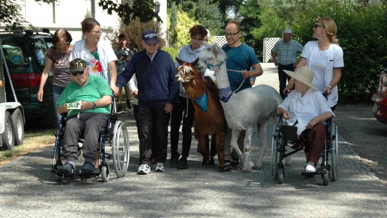 Mieliśmy dzisiaj dużo miłych wrażeń - przyjechały do nas Alpaki z ośrodka "Małe Peru" w Piotrowicach. Przecudne terapeutyczne stworzenia wyglądające jak duże maskotki. Można by o nich powiedzieć: "dłuuugie szyje do przytulania". Na początku wzbudzały trochę respektu - ale szybko podbiły serca dosłownie wszystkich. Wprawdzie nie wszyscy chcieli je nakarmić i sami zjedli marchewkę do karmienia - to się może zdarzyć tylko u nas! Największe zaskoczenie przeżyły chyba jednak osoby leżące, gdy przy swoim łóżku ujrzały takie "uśmiechnięte stwory". W każdym razie na koniec "popatrzyliśmy sobie z Alpakami w oczy" i umówiliśmy się na następne spotkanie w przyszłym roku.