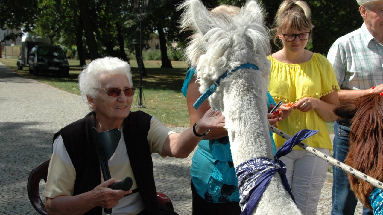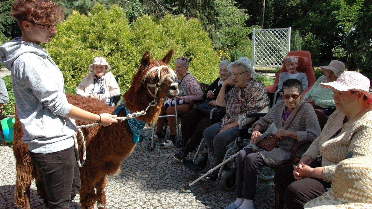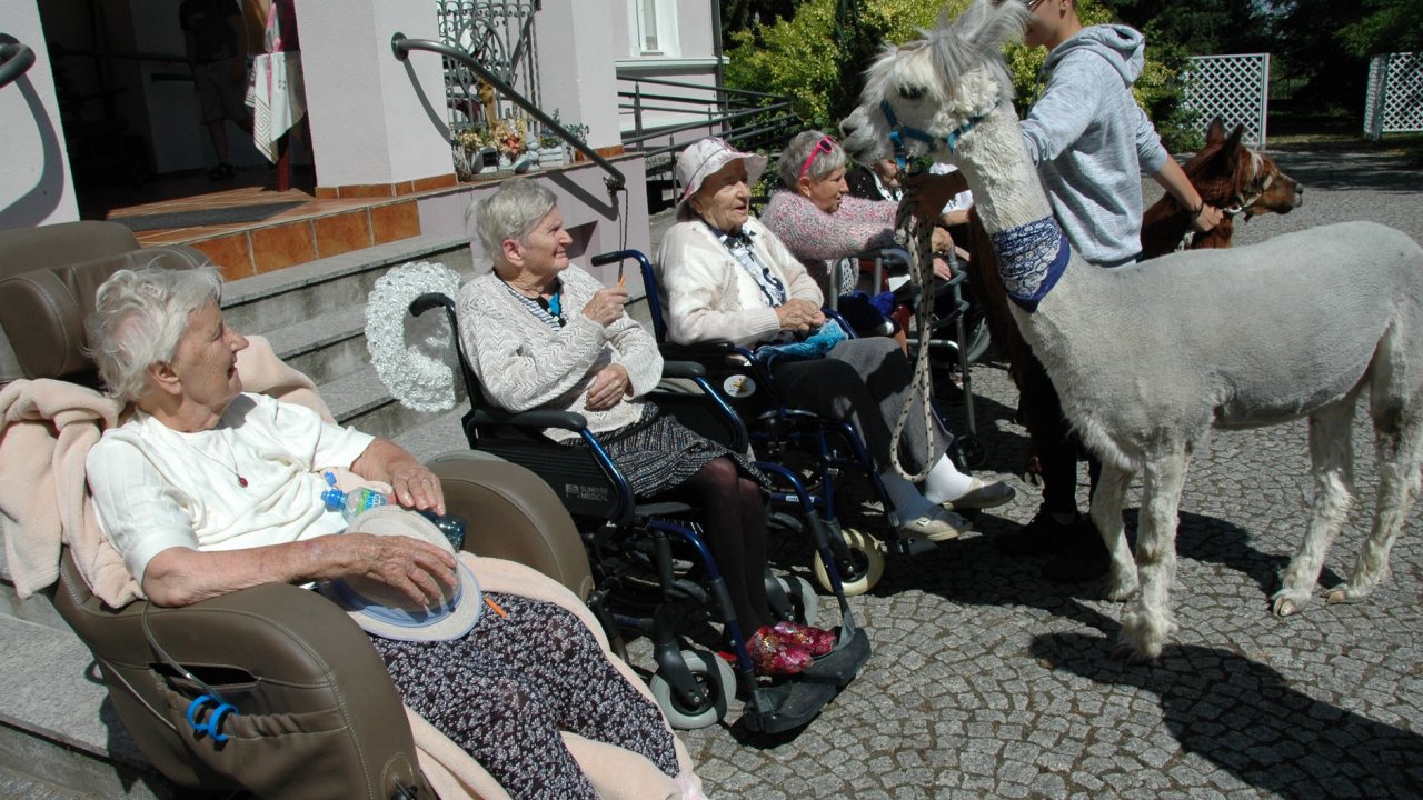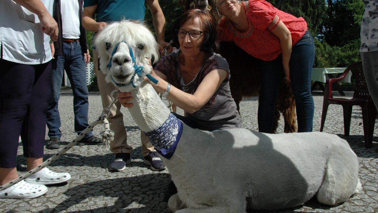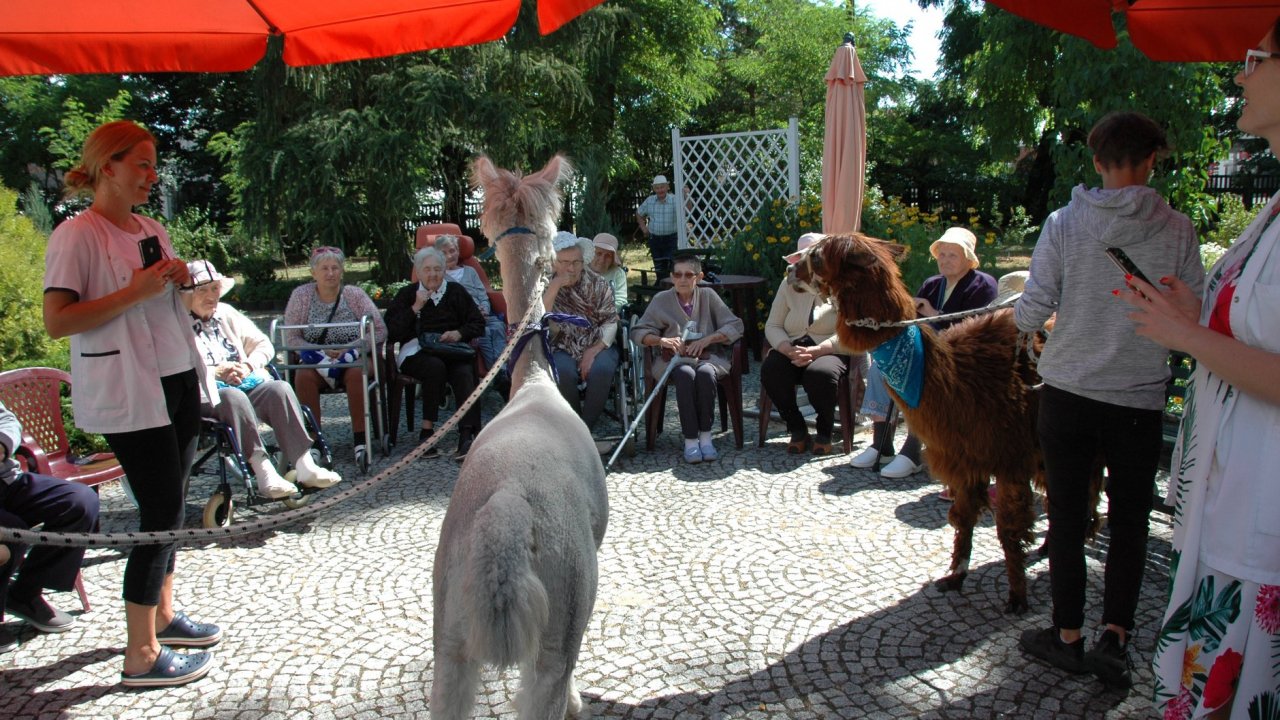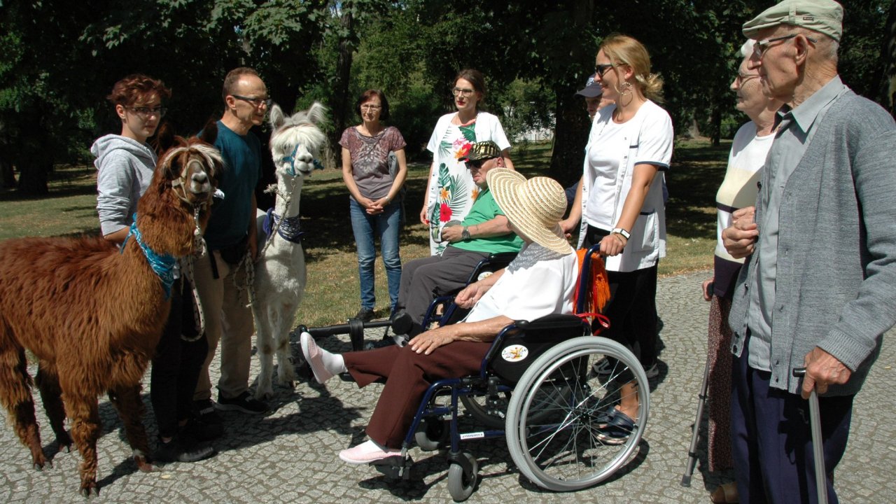 Mieliśmy dzisiaj dużo miłych wrażeń - przyjechały do nas Alpaki z ośrodka "Małe Peru" w Piotrowicach. Przecudne terapeutyczne stworzenia wyglądające jak duże maskotki. Można by o nich powiedzieć: "dłuuugie szyje do przytulania". Na początku wzbudzały trochę respektu - ale szybko podbiły serca dosłownie wszystkich. Wprawdzie nie wszyscy chcieli je nakarmić i sami zjedli marchewkę do karmienia - to się może zdarzyć tylko u nas! Największe zaskoczenie przeżyły chyba jednak osoby leżące, gdy przy swoim łóżku ujrzały takie "uśmiechnięte stwory". W każdym razie na koniec "popatrzyliśmy sobie z Alpakami w oczy" i umówiliśmy się na następne spotkanie w przyszłym roku.
