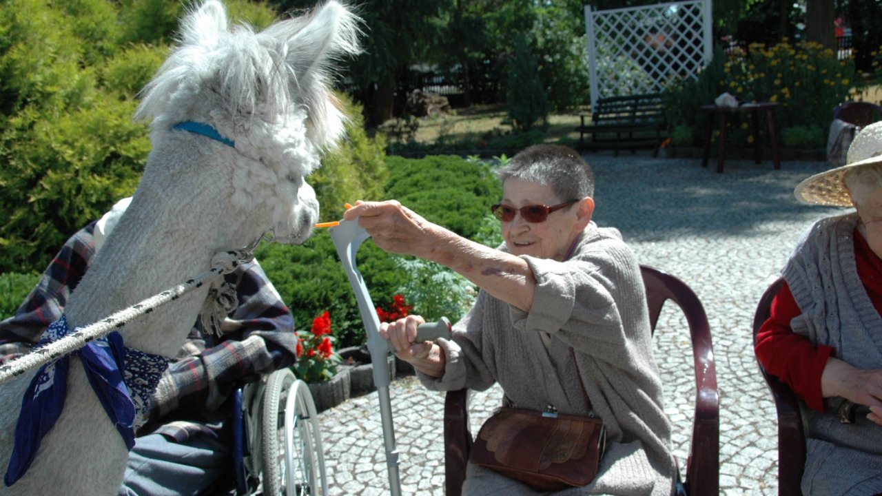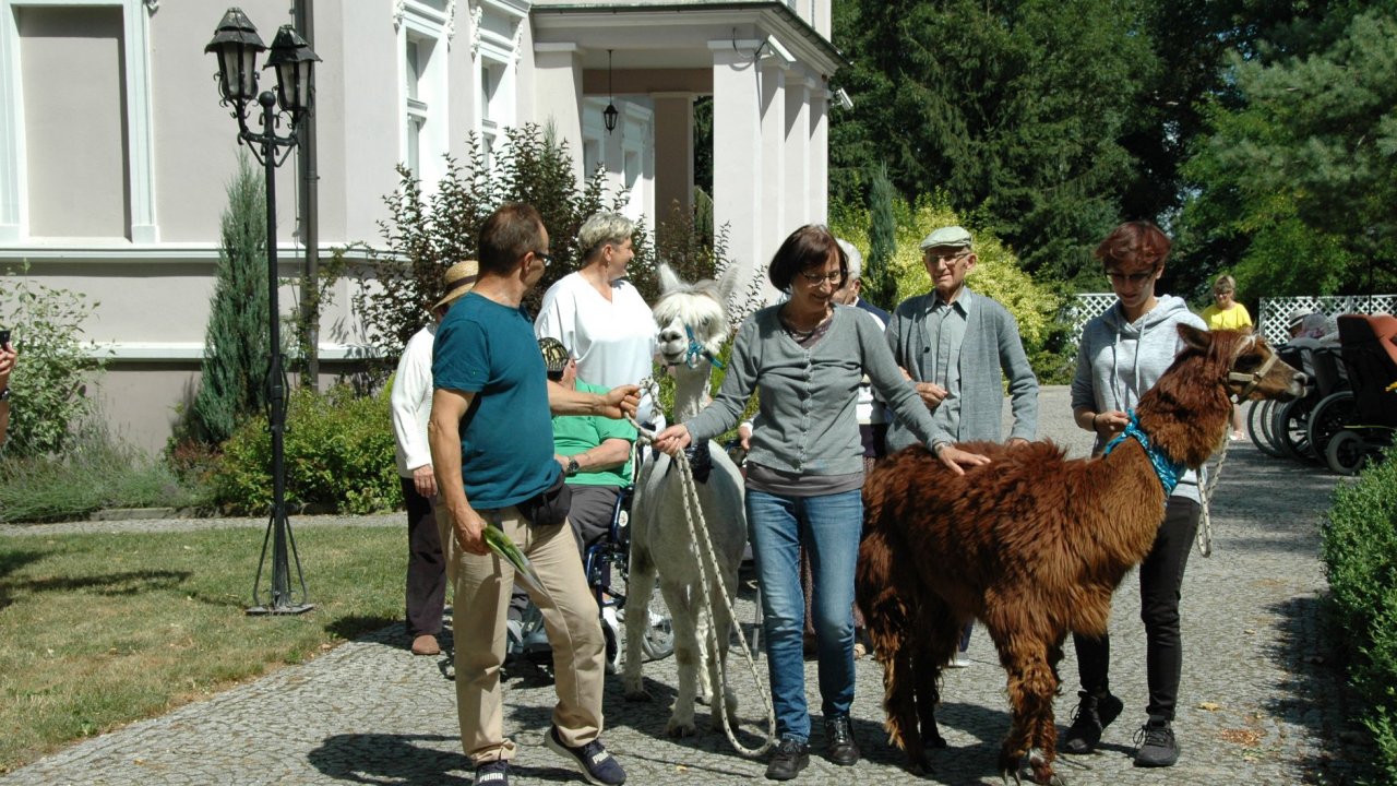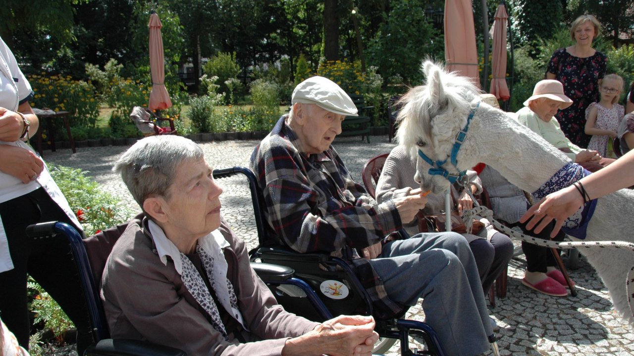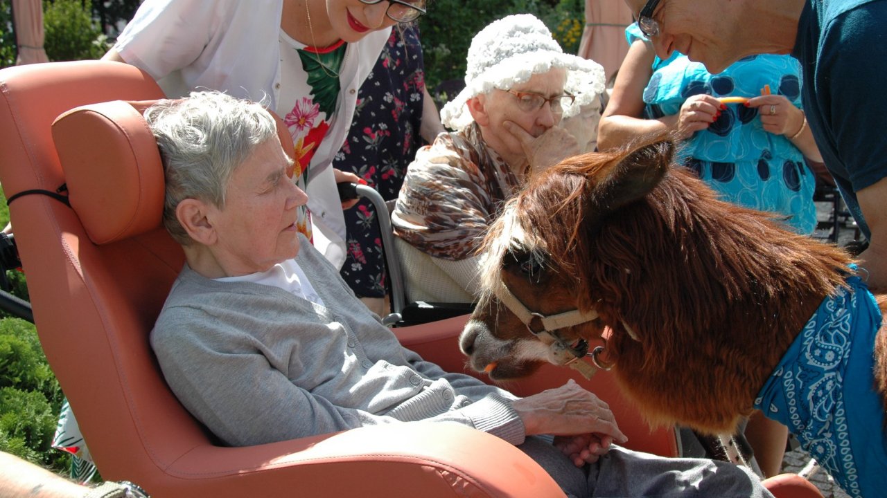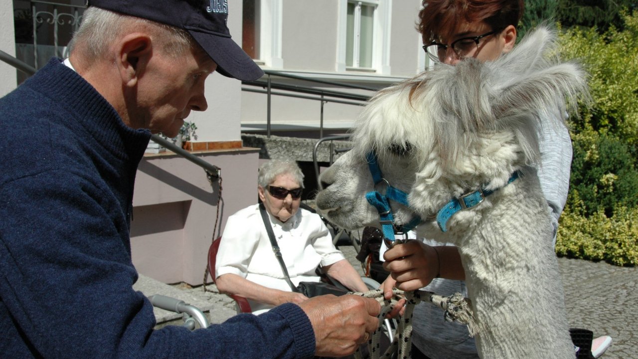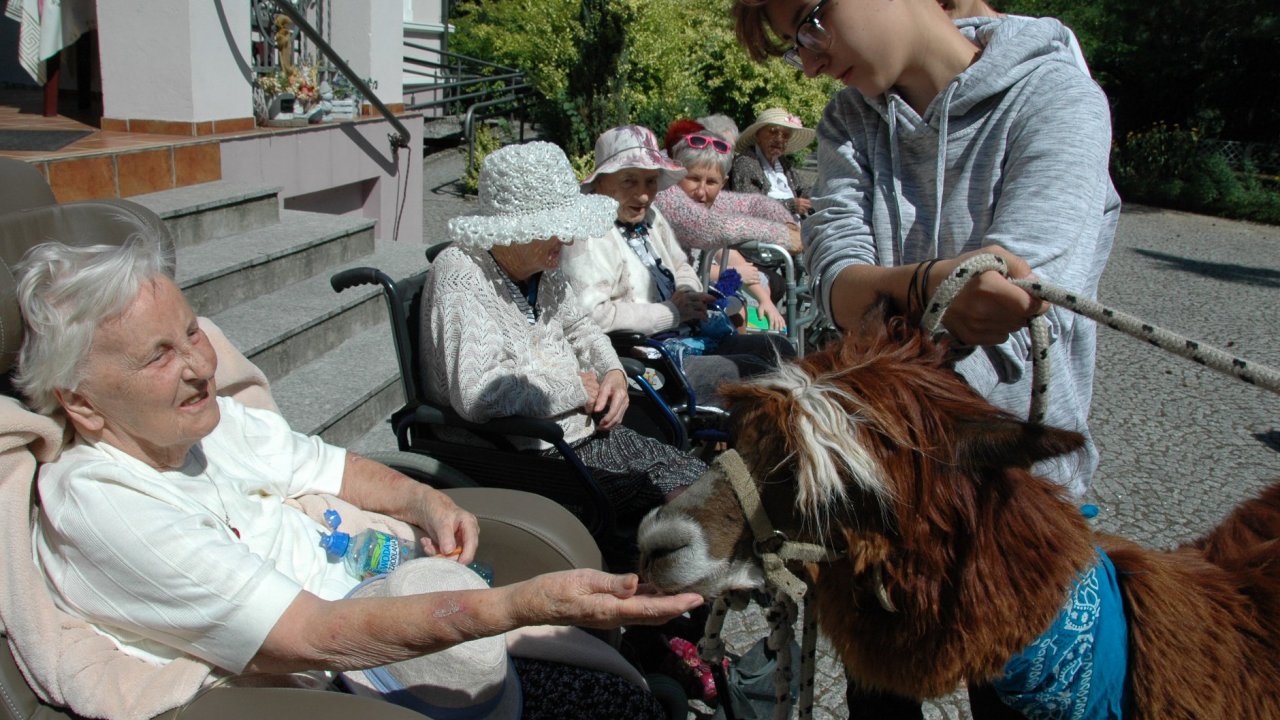 Mieliśmy dzisiaj dużo miłych wrażeń - przyjechały do nas Alpaki z ośrodka "Małe Peru" w Piotrowicach. Przecudne terapeutyczne stworzenia wyglądające jak duże maskotki. Można by o nich powiedzieć: "dłuuugie szyje do przytulania". Na początku wzbudzały trochę respektu - ale szybko podbiły serca dosłownie wszystkich. Wprawdzie nie wszyscy chcieli je nakarmić i sami zjedli marchewkę do karmienia - to się może zdarzyć tylko u nas! Największe zaskoczenie przeżyły chyba jednak osoby leżące, gdy przy swoim łóżku ujrzały takie "uśmiechnięte stwory". W każdym razie na koniec "popatrzyliśmy sobie z Alpakami w oczy" i umówiliśmy się na następne spotkanie w przyszłym roku.