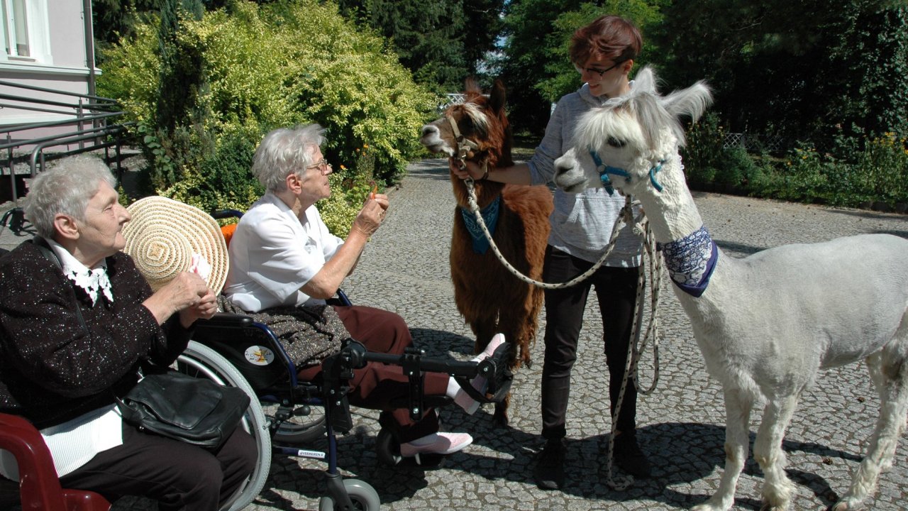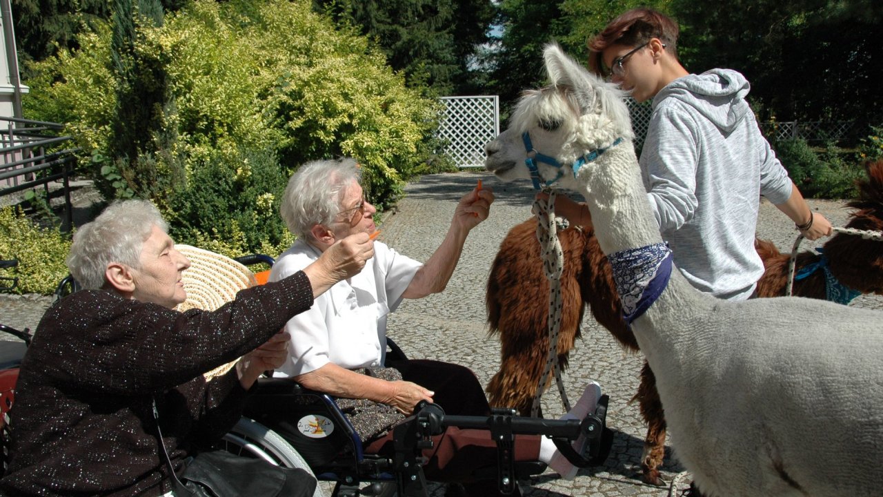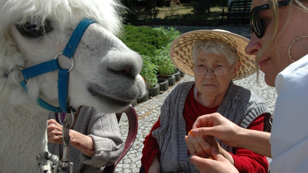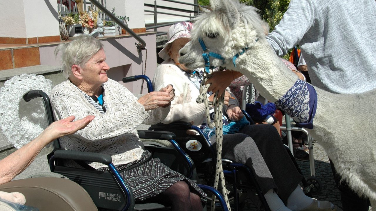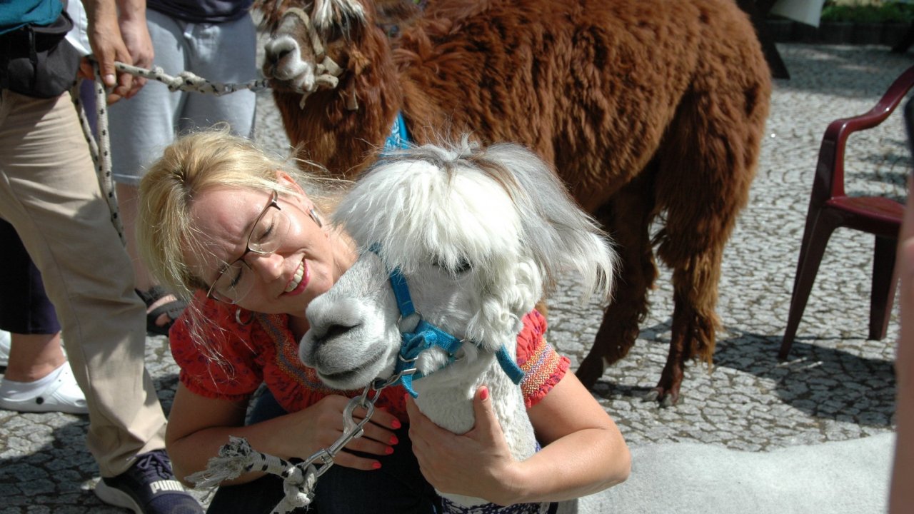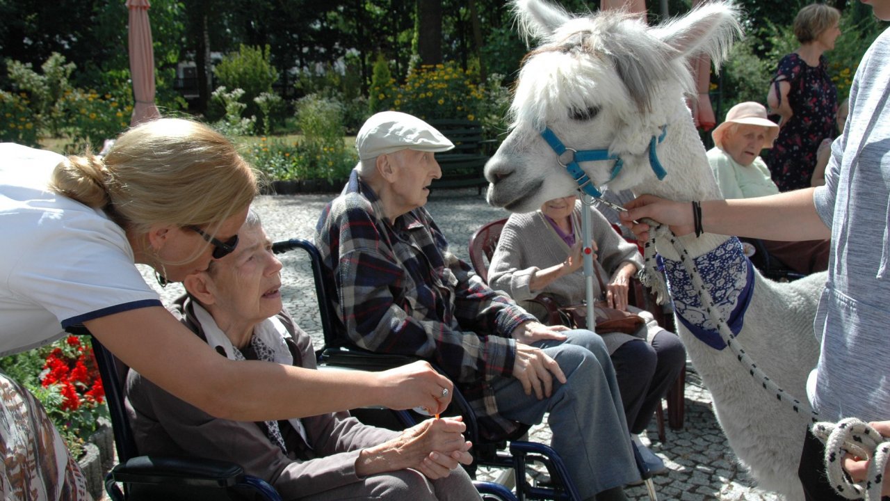 Mieliśmy dzisiaj dużo miłych wrażeń - przyjechały do nas Alpaki z ośrodka "Małe Peru" w Piotrowicach. Przecudne terapeutyczne stworzenia wyglądające jak duże maskotki. Można by o nich powiedzieć: "dłuuugie szyje do przytulania". Na początku wzbudzały trochę respektu - ale szybko podbiły serca dosłownie wszystkich. Wprawdzie nie wszyscy chcieli je nakarmić i sami zjedli marchewkę do karmienia - to się może zdarzyć tylko u nas! Największe zaskoczenie przeżyły chyba jednak osoby leżące, gdy przy swoim łóżku ujrzały takie "uśmiechnięte stwory". W każdym razie na koniec "popatrzyliśmy sobie z Alpakami w oczy" i umówiliśmy się na następne spotkanie w przyszłym roku.