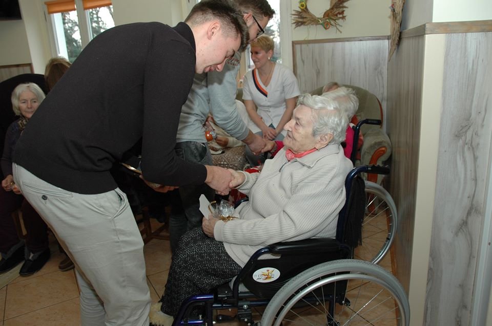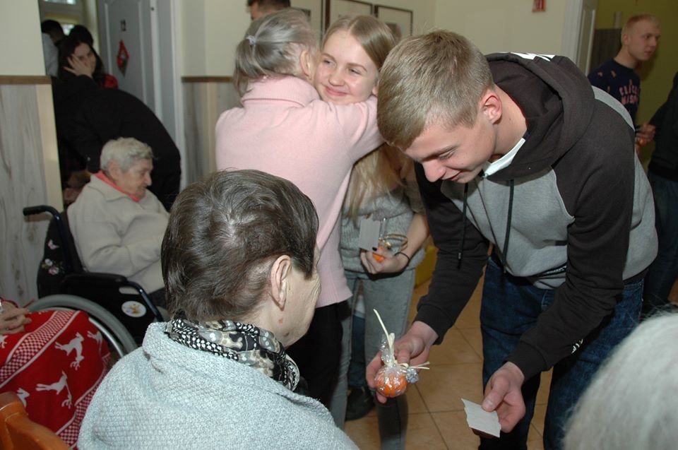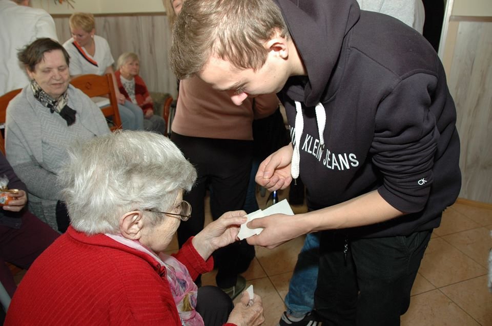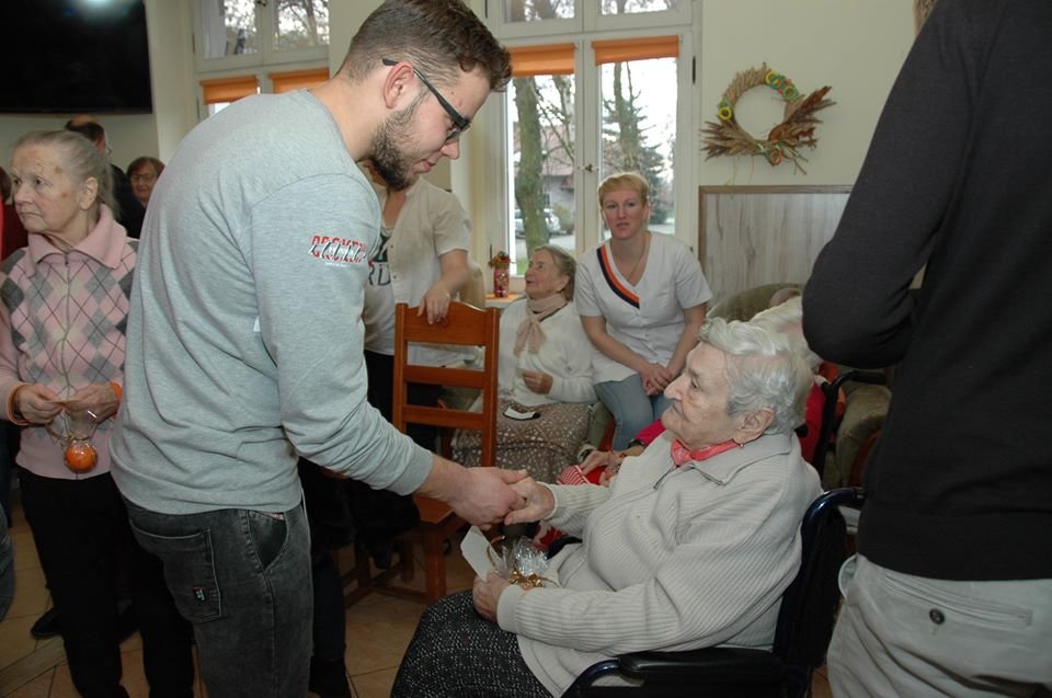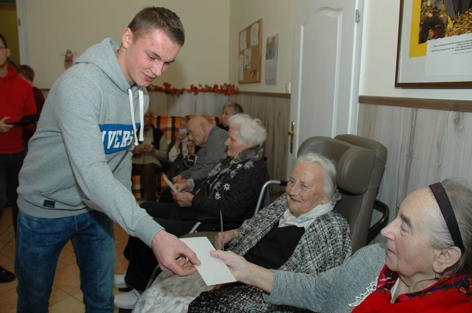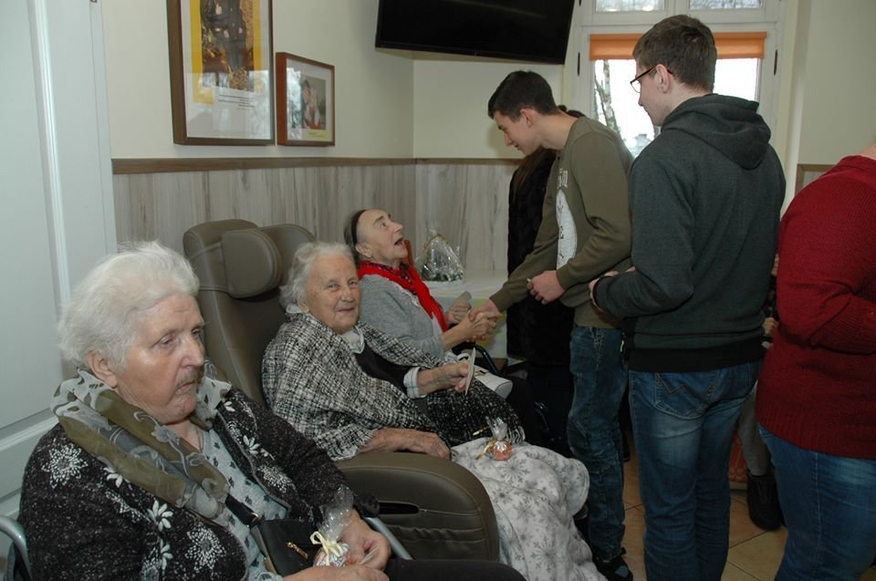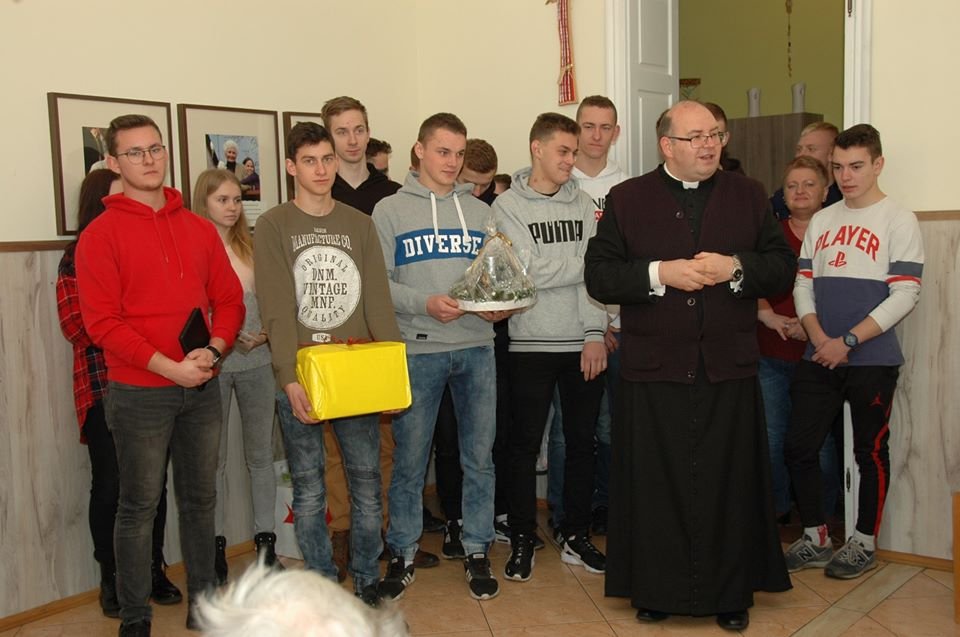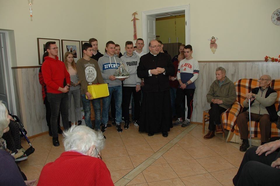 W ten przedświąteczny czas odwiedzili nas uczniowie Zespołu Szkół im. Powstańców Wielkopolskich w Bielicach w ramach wolontariatu "Popiół i Diament Szlachetnych Serc" pod opieką Ks. Marcina Maciejewskiego i Pani Agnieszki Jakubowskiej. Wspaniali młodzi ludzie - pełni odwagi i śmiałości w relacji do starszych, schorowanych osób. Pełni dobra - niby tak zwyczajnego, a jednak miło zaskakującego gdy się je spotyka. Tak lubimy powtarzać to nasze zdanie, że "świat nie zginie dopóki wciąż są jeszcze dobrzy młodzi ludzie". Bardzo dziękujemy za wszystko - za opłatek, za rozczulające dary, za te parę słów, za przywiezione betlejemskie światło pokoju. Gratulujemy pani Agnieszce i księdzu Marcinowi. Wszystkim życzymy radości.