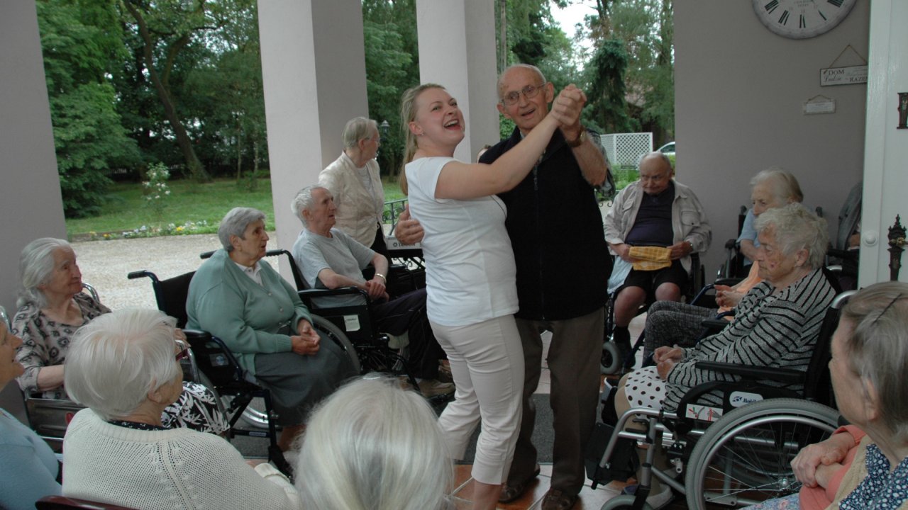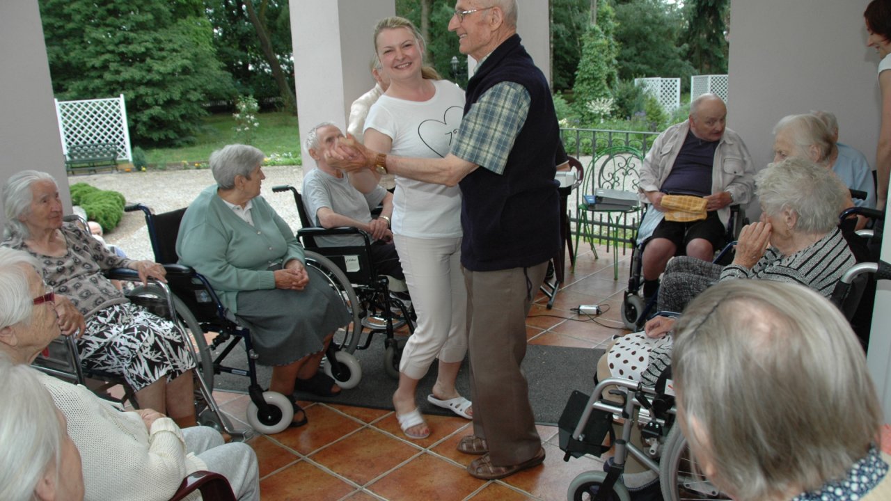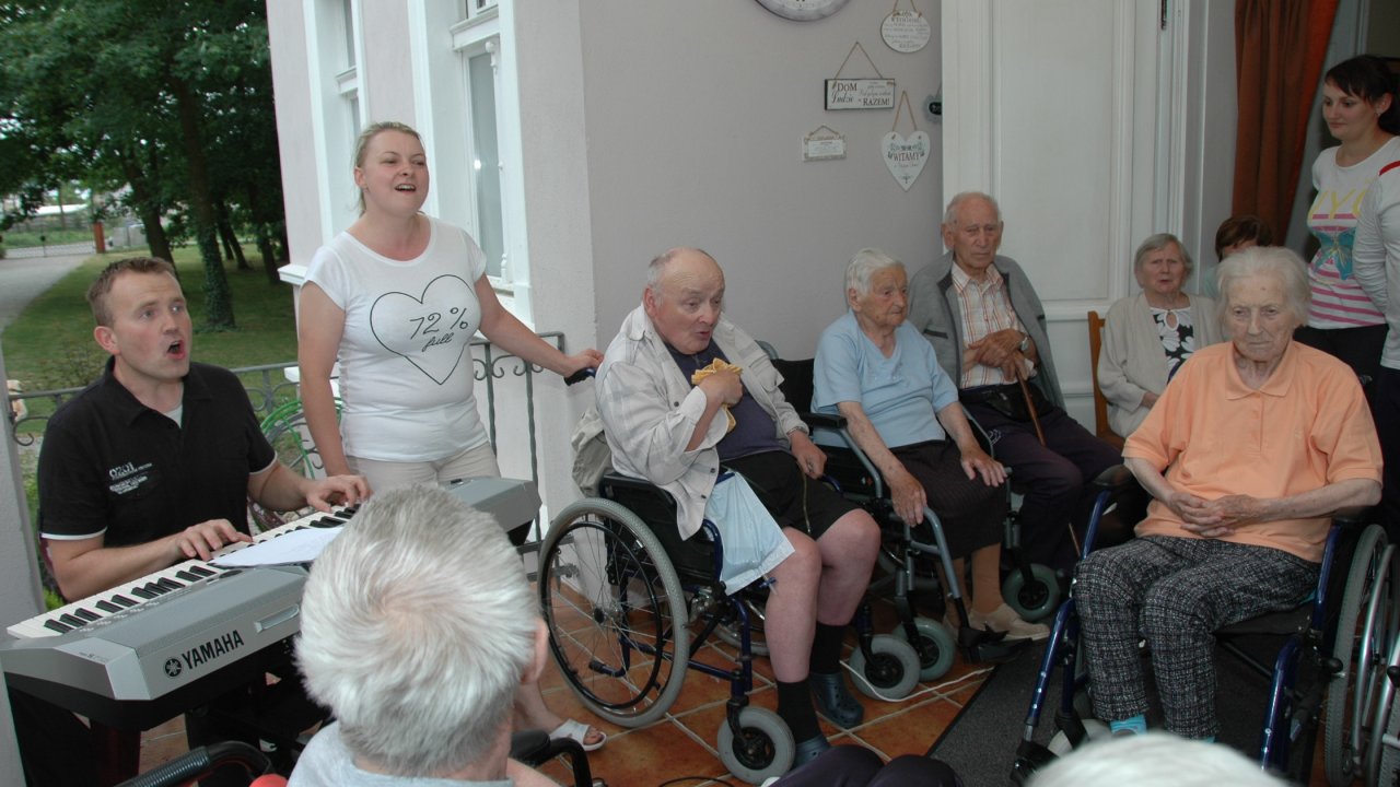 Weranda zawsze nam się dobrze kojarzy – można na niej posiedzieć w pochmurny dzień, nie trzeba daleko iść, gdy bolą nogi, świetnie się na niej śpiewa – a nawet tańczy! – szczególnie, gdy pan Bartek rozstawi „klawisze” i zaczyna grać piosenki z dawnych lat.