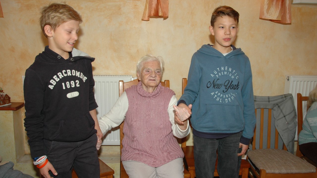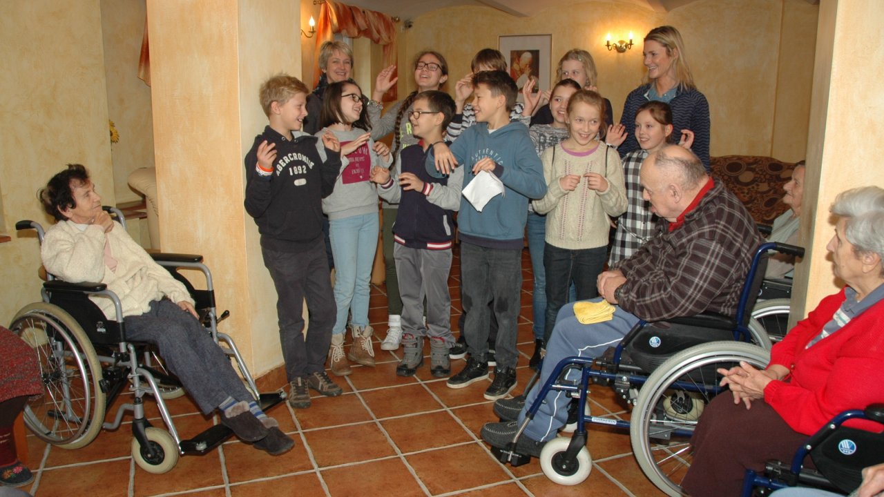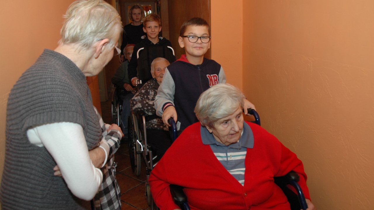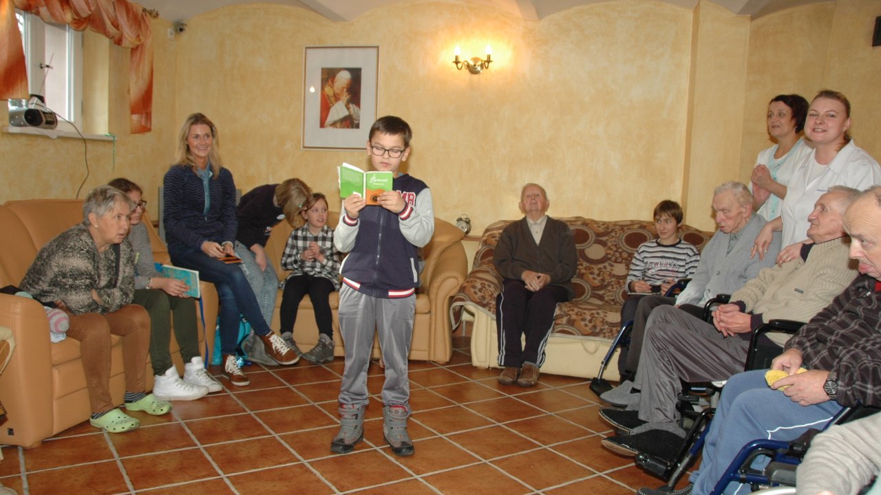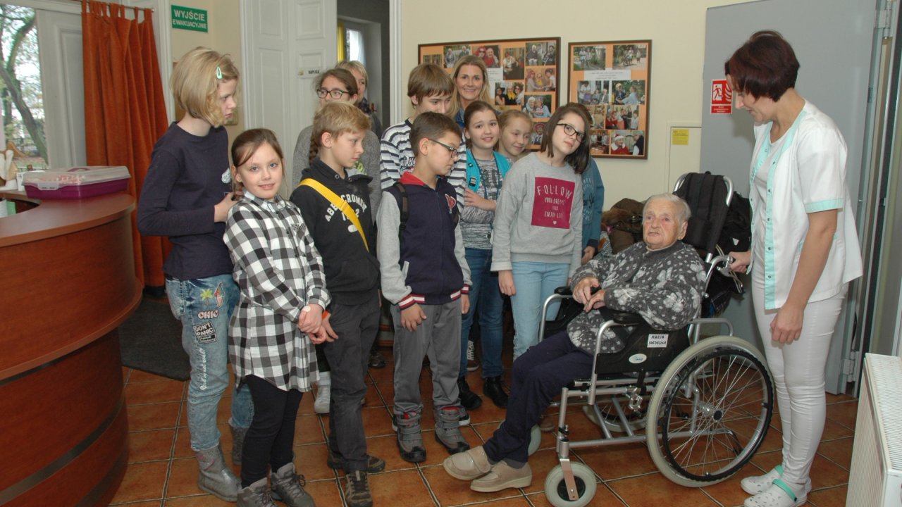 Mamy szczęście do dobrych dzieci – tym razem przyjechały do nas ze Szkoły Podstawowej Zakonu Pijarów w Poznaniu. Tyle wokół narzekania na dzieci i młodzież – a w naszym domu zawsze nas zaskakują swoją wrażliwością, odwagą, chęcią pomocy. Gotowością wspólnej zabawy z ludźmi starszymi od siebie o 80 lat. Przekraczaniem swojej nieśmiałości i lęku – gdy może po raz pierwszy w życiu chwyta się za wózek inwalidzki. Bardzo dziękujemy pani Grażynce, pani Krysi, Rodzicom i naszym młodym „opiekunom” za ten wspólny dobry czas.