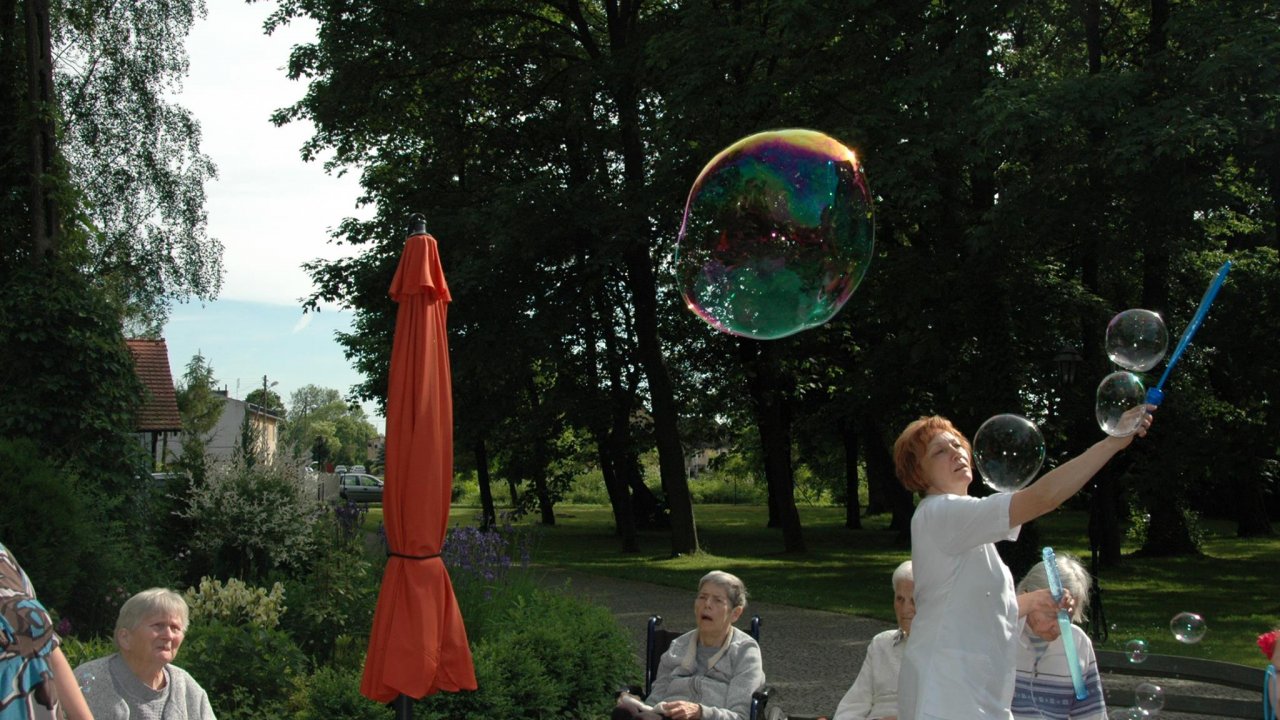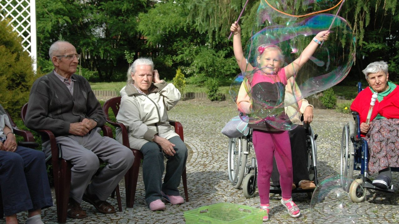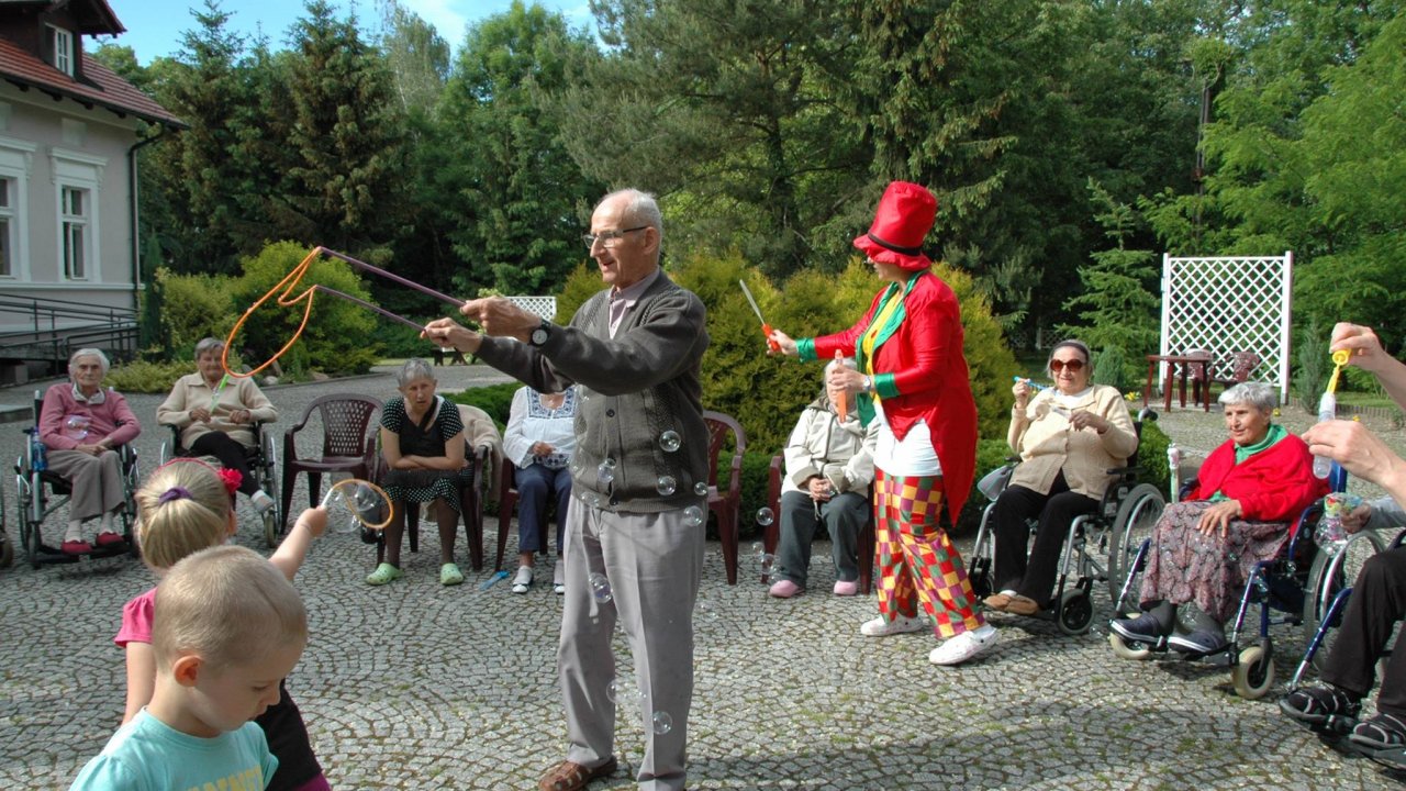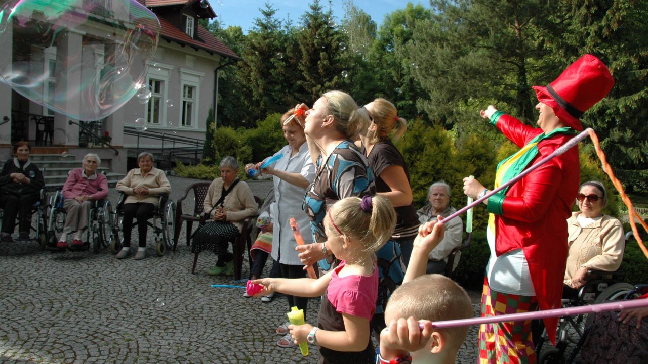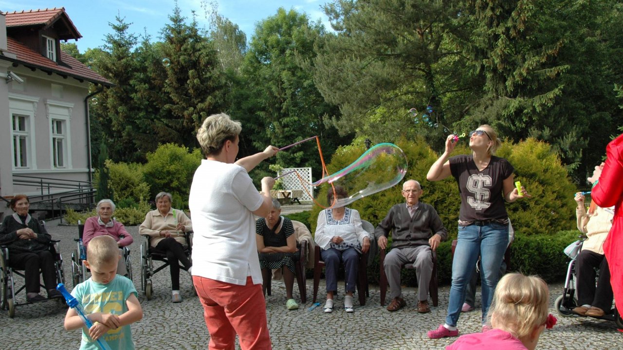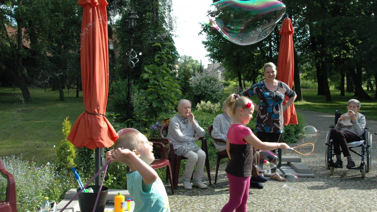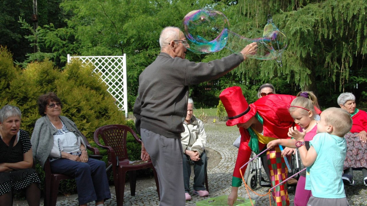 Wystarczyły mydlane bańki i od razu objawiło się, że w każdym z nas nadal jest wiele z dzieci. Pani Sylwia wyczarowała prawdziwą "inwazję" mydlanych cudów - małych, wielkich, kolorowo-bajecznych... Każdy chciał i mógł spróbować powrotu do dzieciństwa. Czasami zapominamy, że w bardzo prosty sposób można obudzić czystą dziecięcą radość. Zapraszamy na następny Dzień Dziecka w domu pełnym staruszków.
