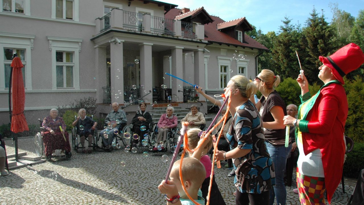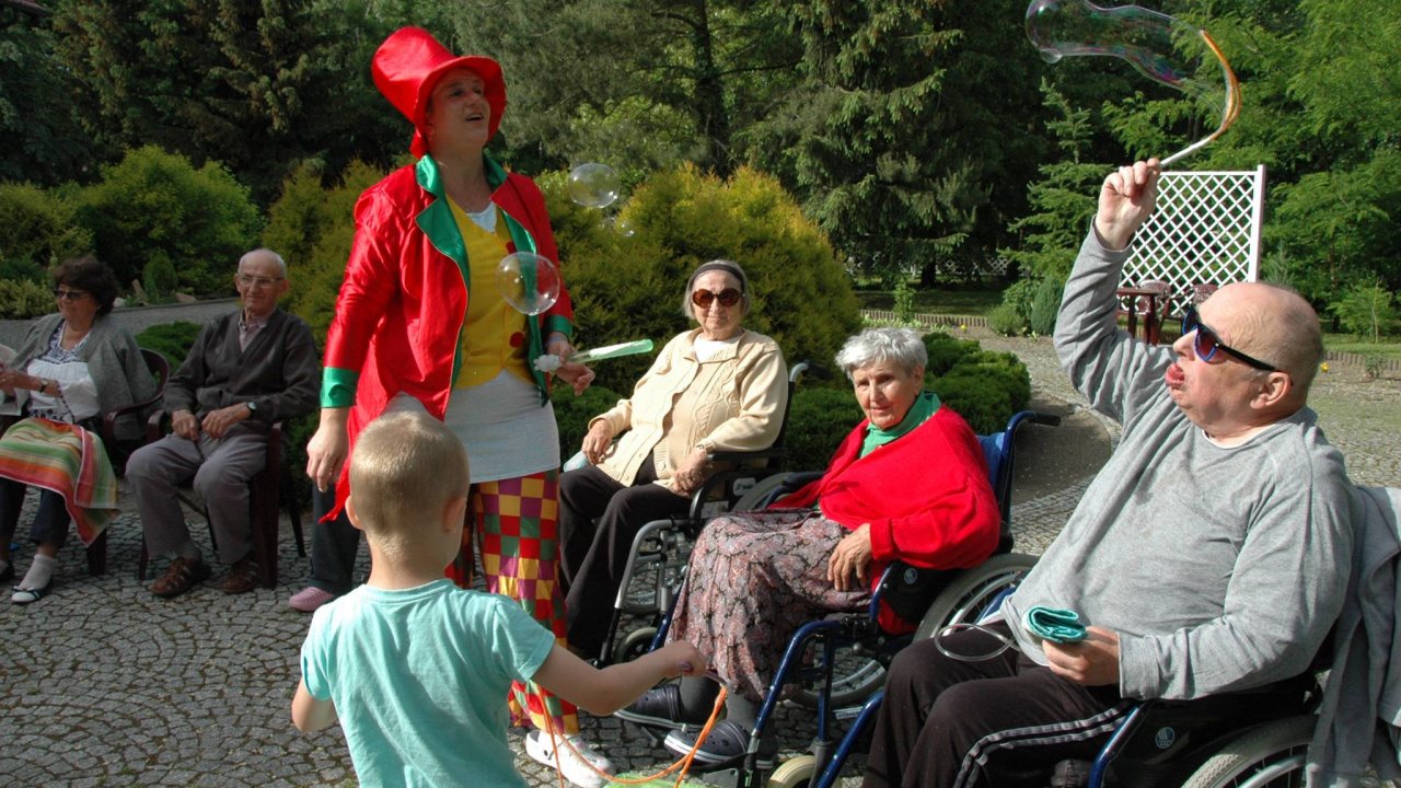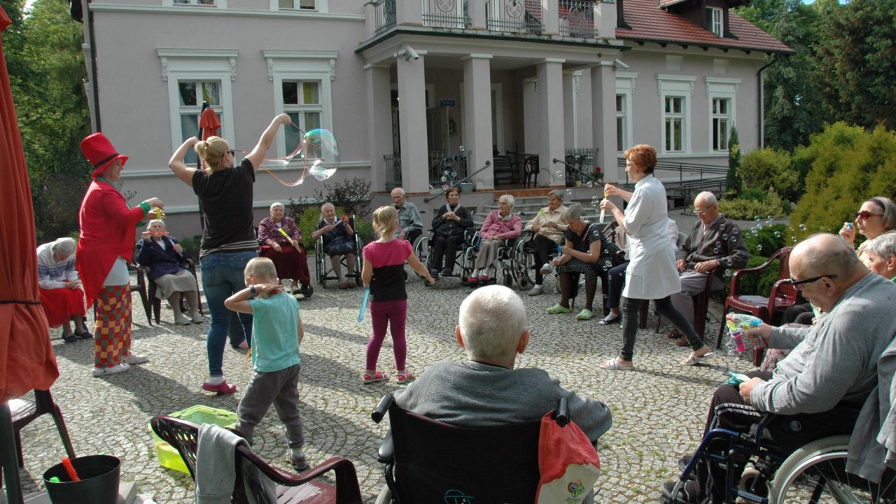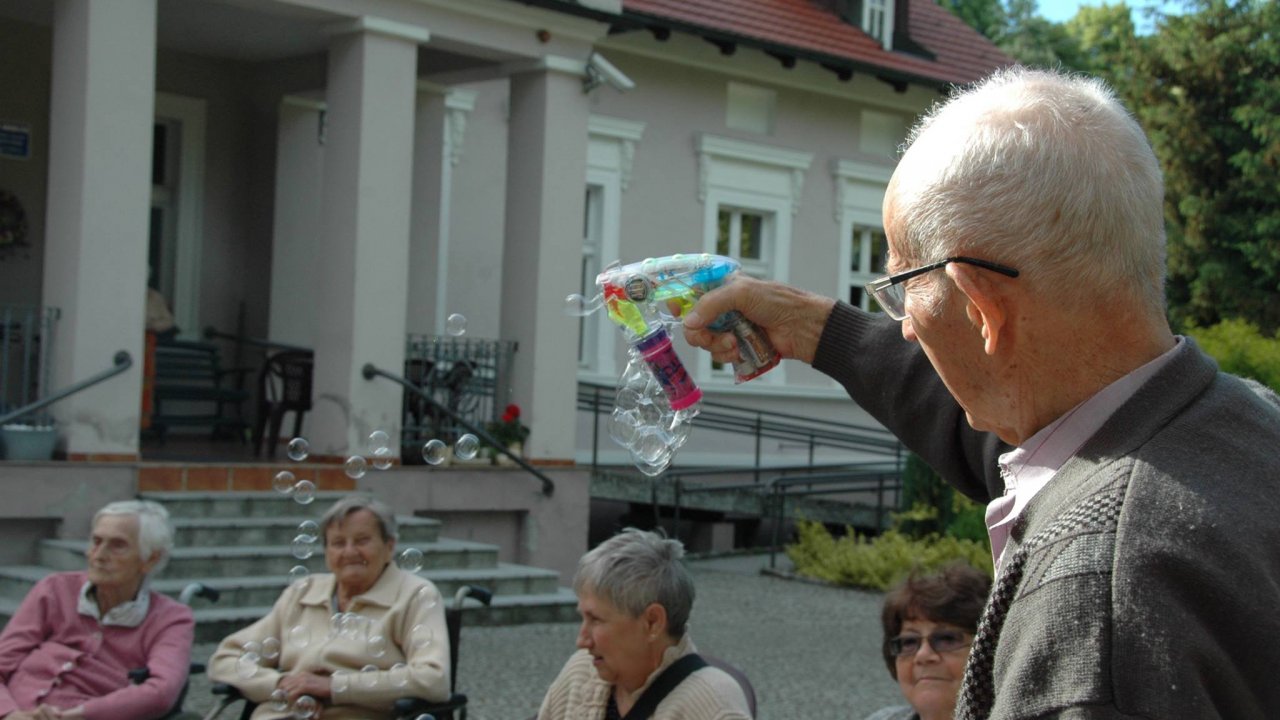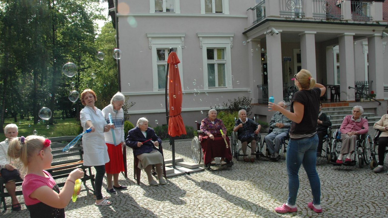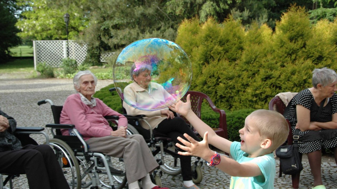 Wystarczyły mydlane bańki i od razu objawiło się, że w każdym z nas nadal jest wiele z dzieci. Pani Sylwia wyczarowała prawdziwą "inwazję" mydlanych cudów - małych, wielkich, kolorowo-bajecznych... Każdy chciał i mógł spróbować powrotu do dzieciństwa. Czasami zapominamy, że w bardzo prosty sposób można obudzić czystą dziecięcą radość. Zapraszamy na następny Dzień Dziecka w domu pełnym staruszków.